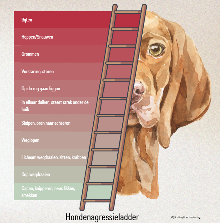 De agressieladder laat zien hoe spanning stap voor stap oploopt. Een hond begint altijd met subtiele signalen. Pas wanneer die niet worden opgemerkt of genegeerd, klimt hij verder op de ladder. Happen, grommen of uitvallen zijn nooit “plotseling gedrag”, maar een laatste redmiddel wanneer eerdere signalen niet zijn gezien.