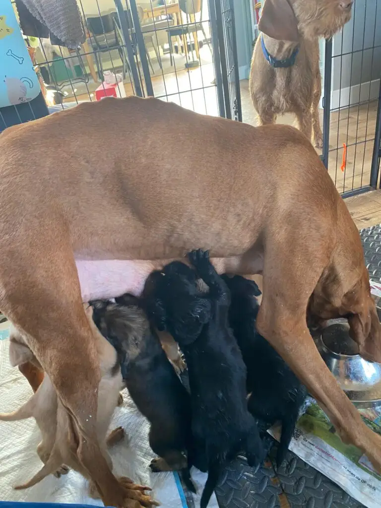 Nu alle puppy’s meer dan een kilo wegen, begint het gastgezin met het bijvoeren. Dankzij de bemiddeling van een van onze vrijwilligers en een hele gulle gift van KIVO maken de pups kennis met versvoer. Als toetje, mogen ze daarna nog even bij moeder Hannah: Helemaal niet gek dat de grafiek van de pups zo’n mooie stijgende lijn laat zien!
