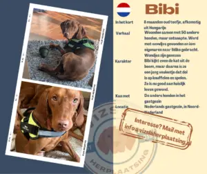 Bibi is een teefje van 8 mnd; 1 van de hondjes die in Hongarije door een dierenbeschermingsorganisatie weggehaald zijn bij iemand die meerdere rassen fokte, maar zodanig ziek was dat ze niet meer kon zorgen. De vizsla’s zijn naar Ildiko gebracht. Bibi had extra zorg nodig; een grote open wond op haar kop moest herstellen en dat is gelukt! Een litteken is de herinnering aan haar Hongaarse leven. Nu zit Bibi in een gastgezin in Drenthe, samen met Janka